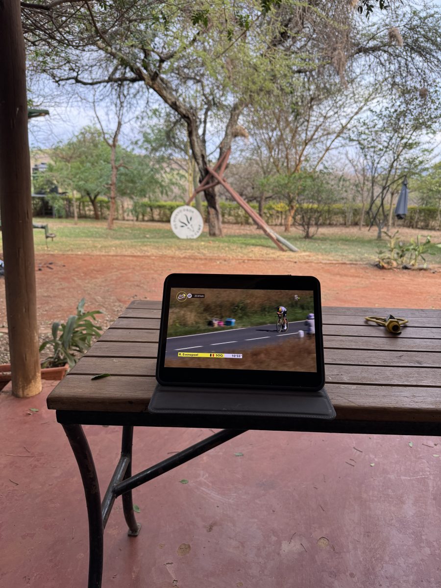 Mijn overnachting: een tentenkamp diep in de natuur. Geen mobiel netwerk. Enkel bij een huisje, omringd door struisvogels, vang ik satellietsignaal. Net genoeg om de Tour de France te volgen en Evenepoel de tijdrit te zien winnen. Soms is geluk klein en onverwacht.